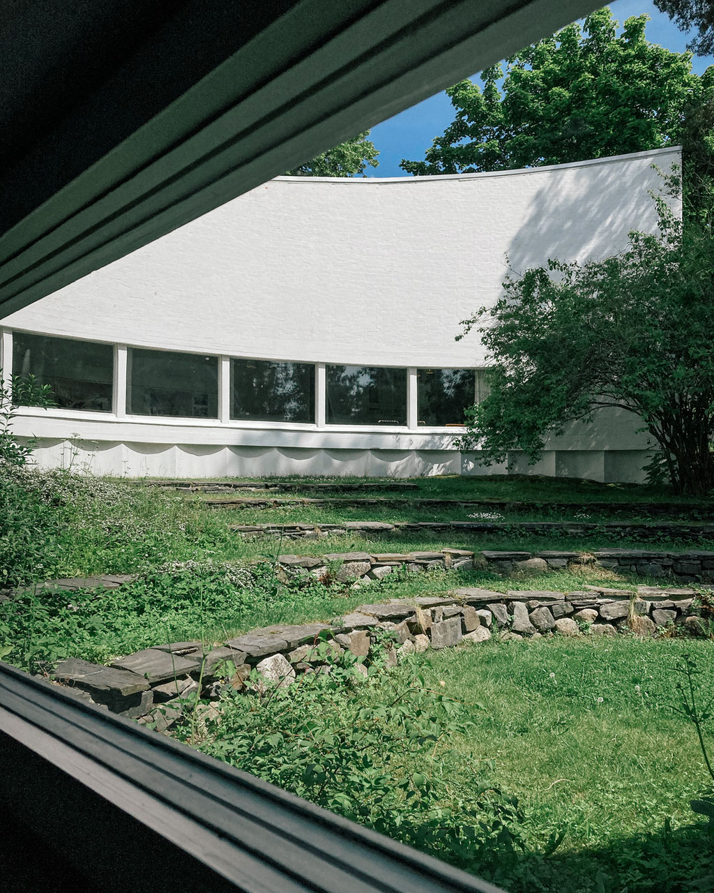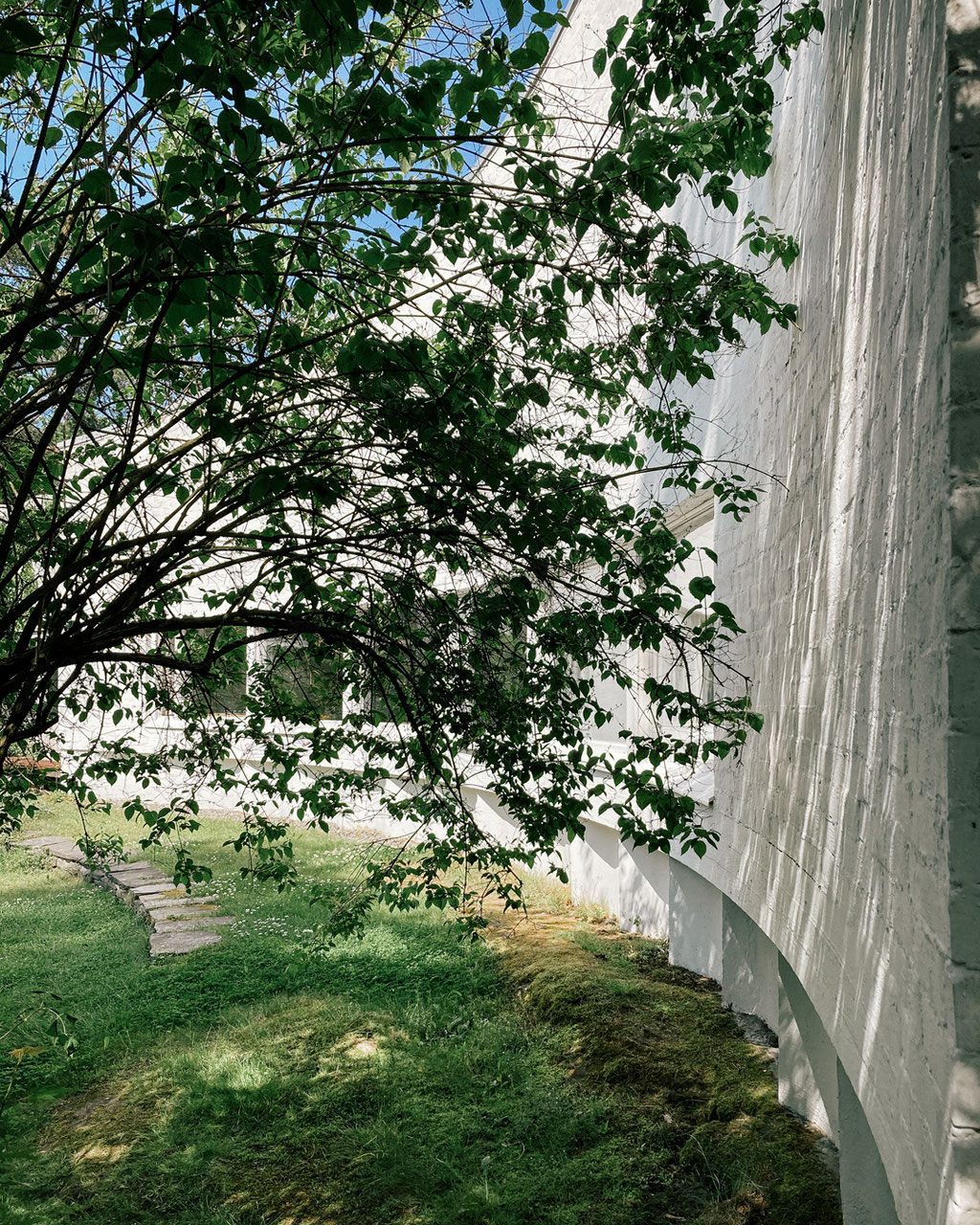 アアルト自邸から歩いて数分、緑に囲まれた小道の先に「スタジオ・アアルト」が現れます。1955年に竣工したこの建物は、白いレンガの壁と木の扉、そして曲線的な外壁が印象的。外部からの視線をやわらかく遮りながら、庭やテラスの緑と自然に溶け込むような佇まいです。道路側から見ると、特徴的な木のガレージが迎えてくれます。内部の中庭は石段状のテラスになっており、ミーティングやイベントなど、さまざまな使い方を想像させます。
