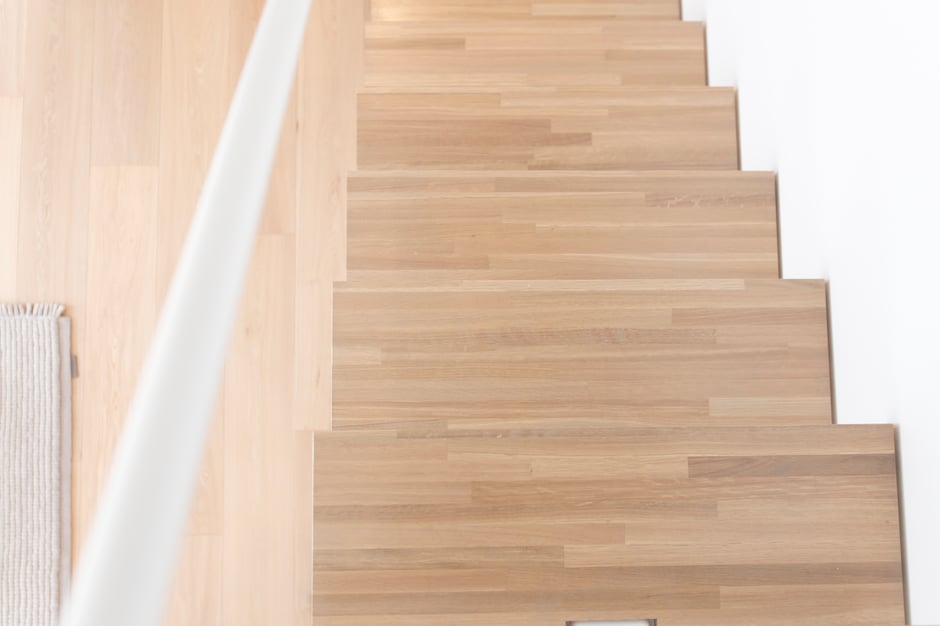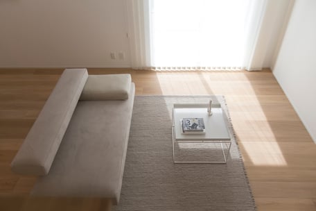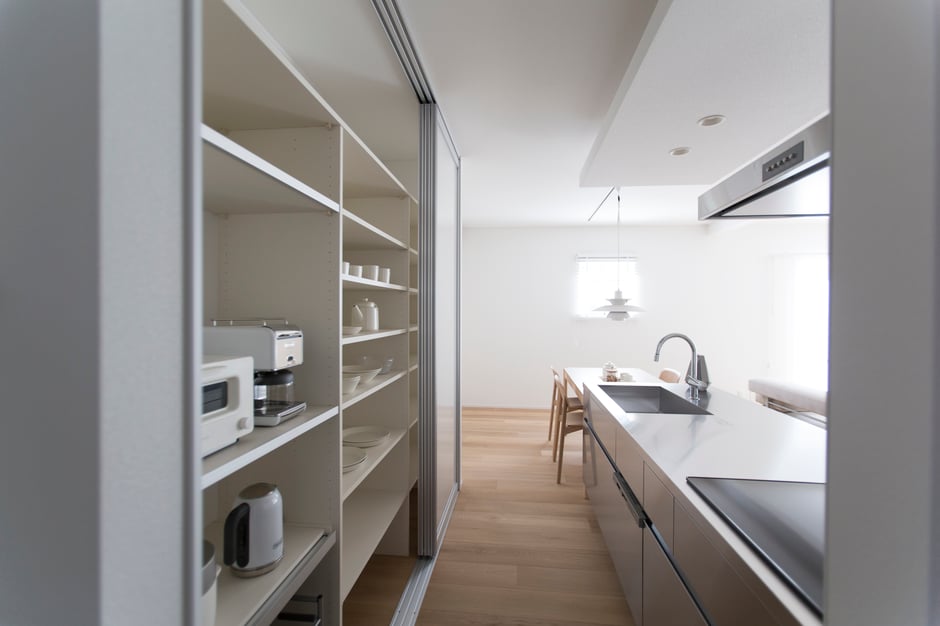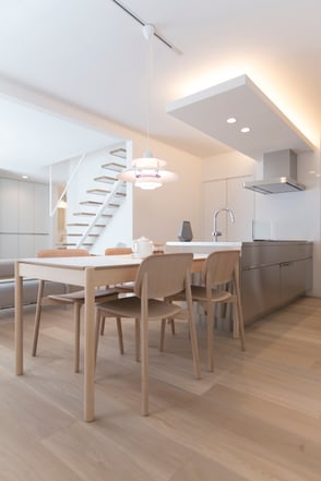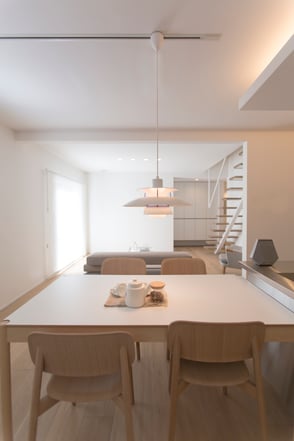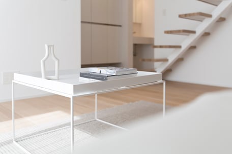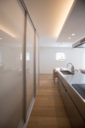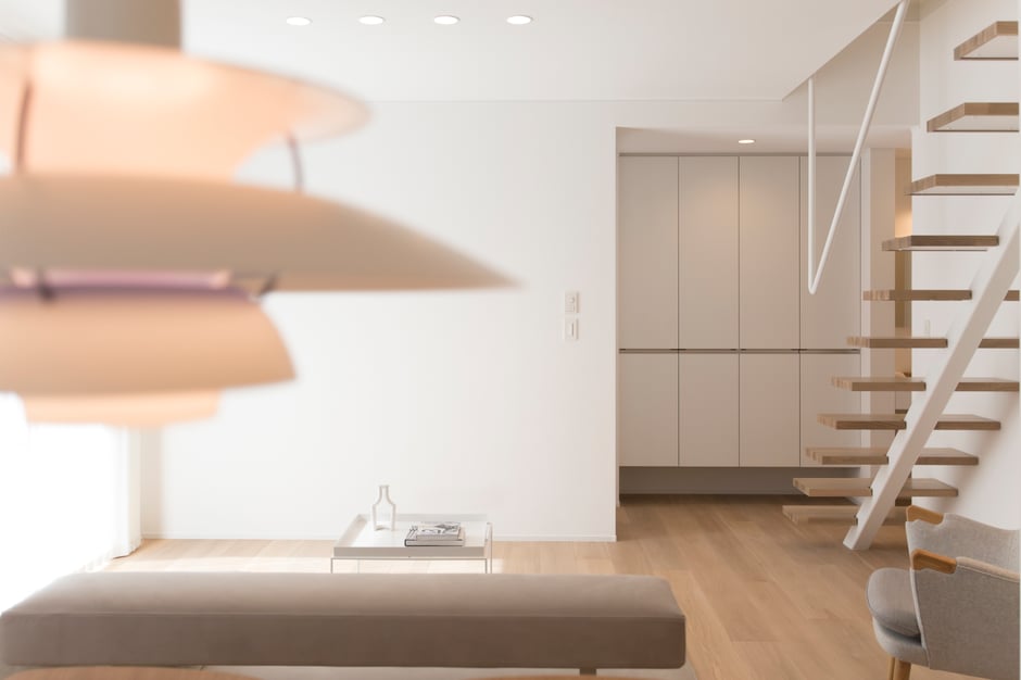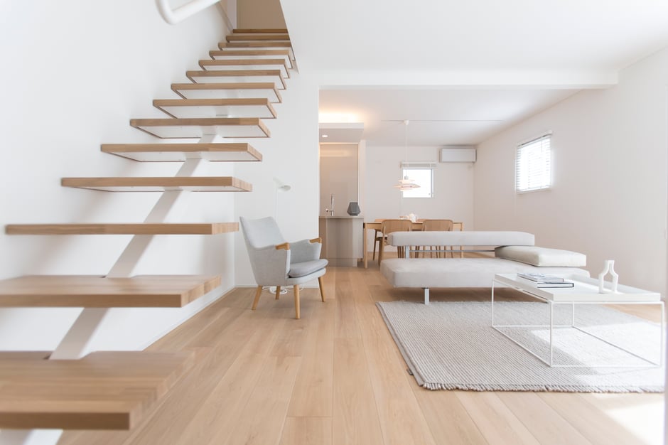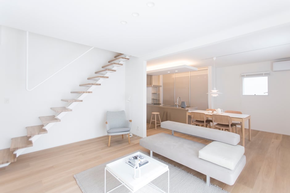 色を整えた空間。圧迫感が無く、部屋が広く感じられるコーディネート。インテリアのようにリビングに馴染んだ、階段のあるハコイエが誕生しました。