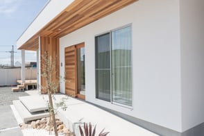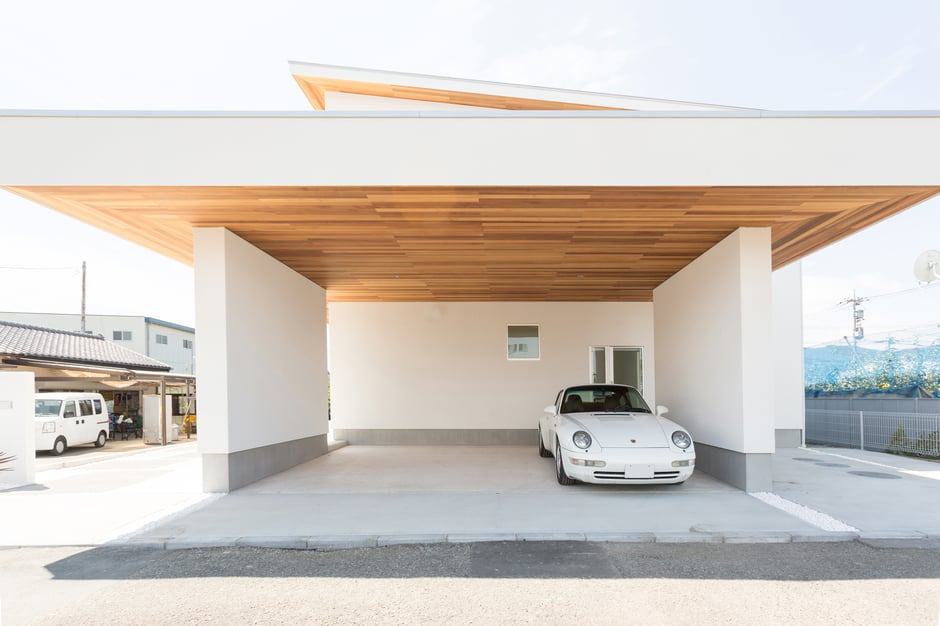 ガレージ軒天全面のレッドシダー。ニレ材を張ったオリジナルオーダーキッチン。