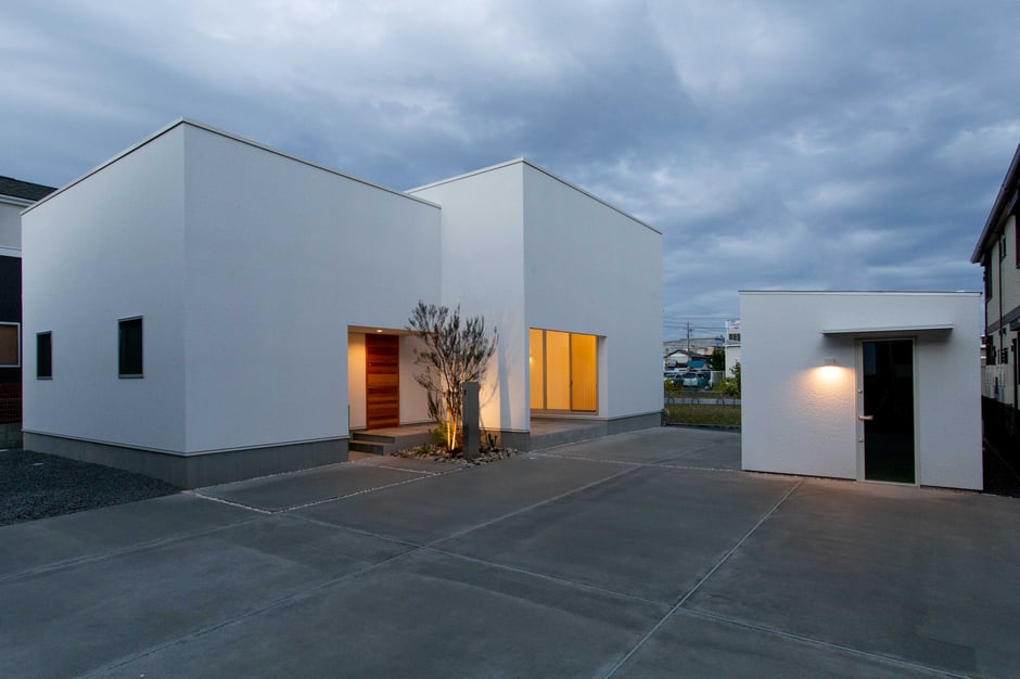 夕暮れに浮かぶ白く四角いフォルム。