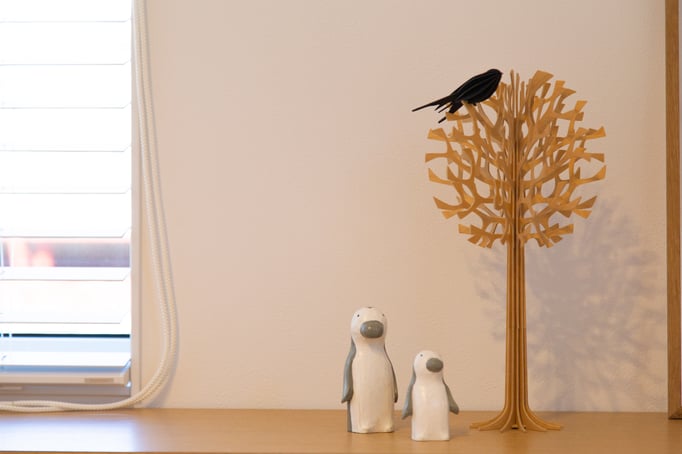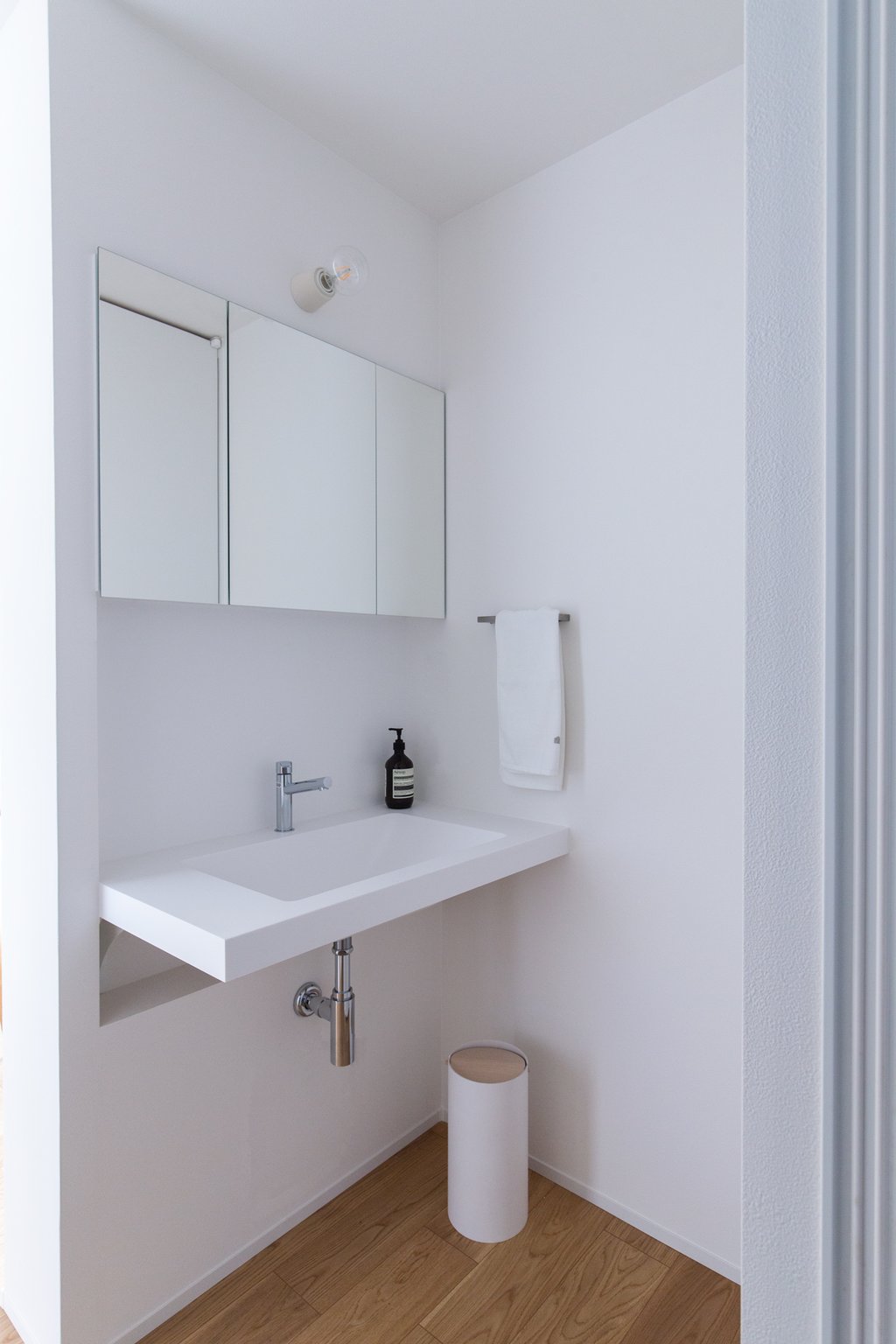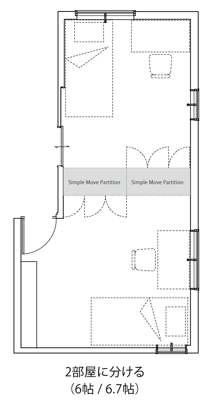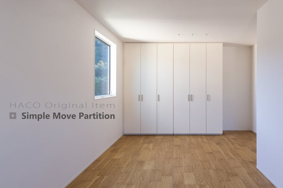 2階には12.7帖のフラットな子ども部屋。部屋の一方に、絵本やおもちゃなどを入れる可動式のオリジナル棚を造作し、反対側にはHACOオリジナルアイテム「simple move partition」を配置。子どもが大きくなり、自室が欲しいときには「simple move partition」を動かして1室を2室に変更。間取りを手軽に変えられる設備を、家を建てる段階から導入することで、いつまでも住み良い家に。