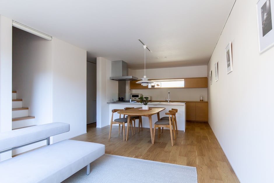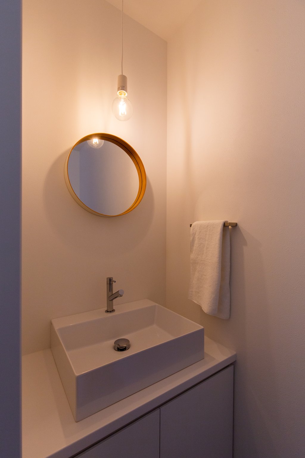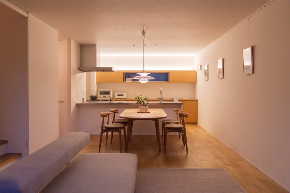 夕闇のハコイエ。主寝室のLE KLINTが柔らかく浮かび上がる。