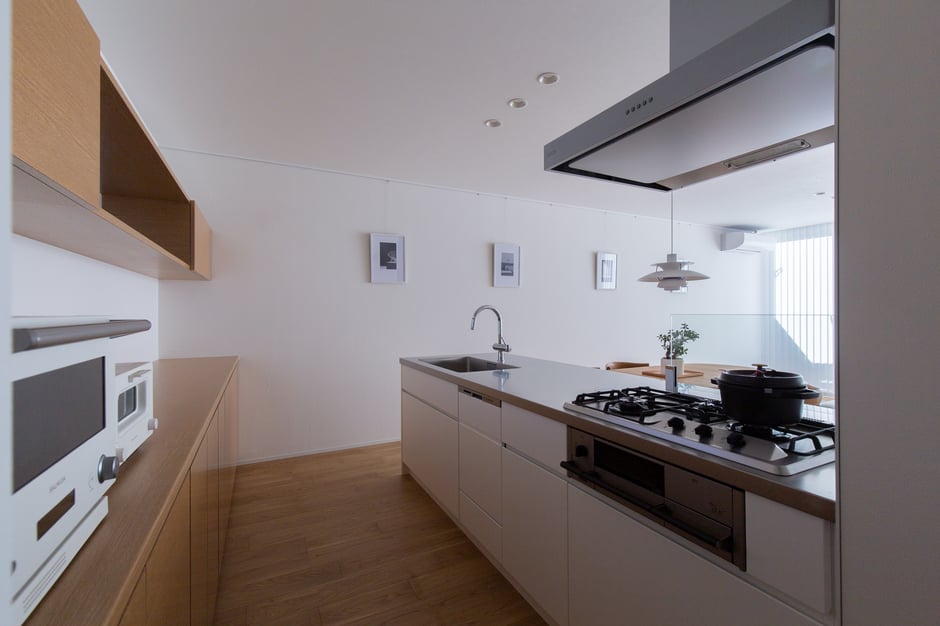 HACOオリジナル「simple kitchen」「simple cupboard」。ホワイトと木目の組み合わせ。