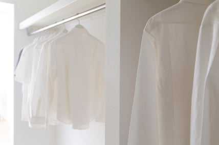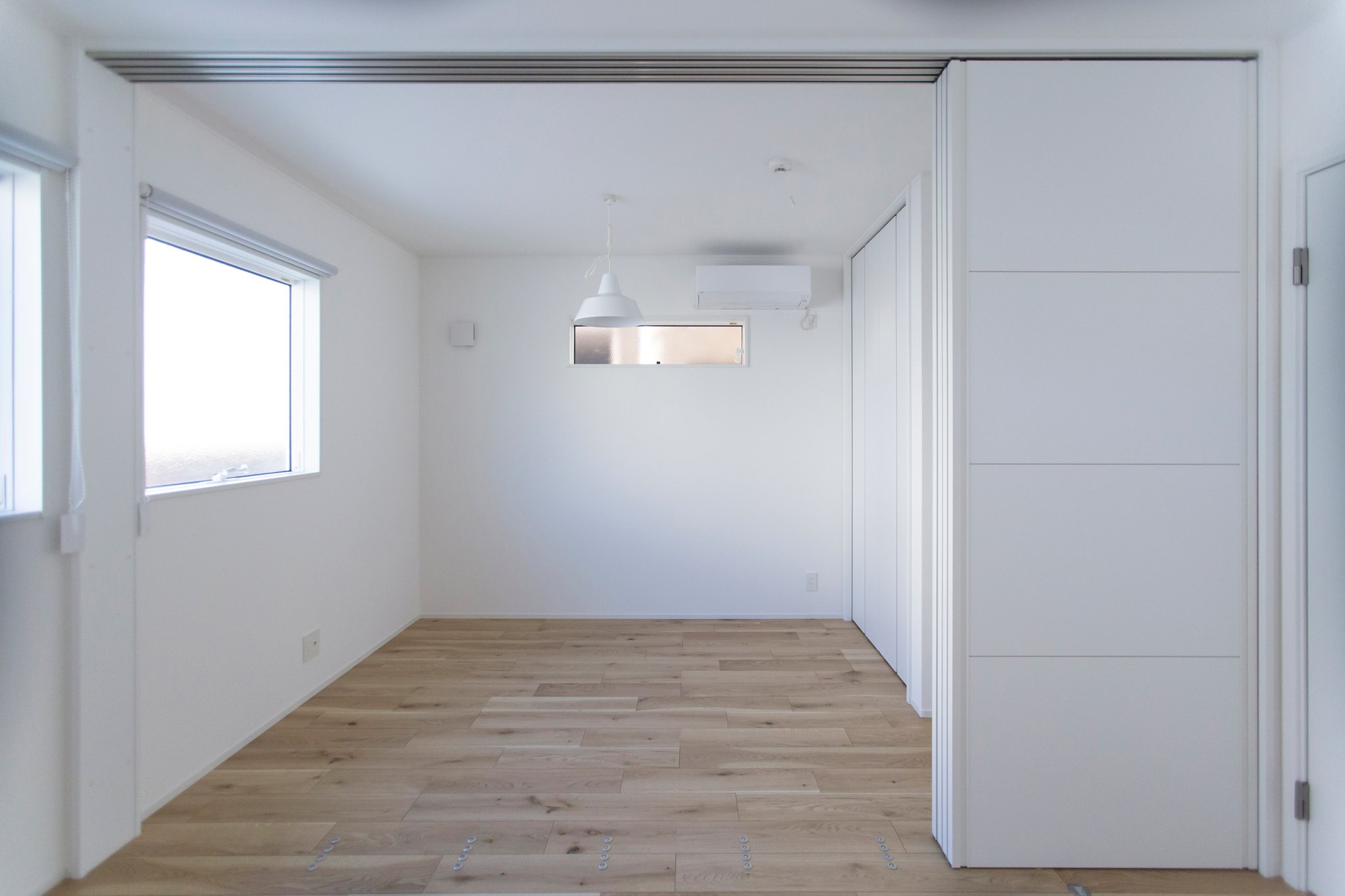 天井まで届くハイタイプの全面収納。棚の高さを収納する物にあわせて変える、空間を無駄なく使う可動棚。必要なものを必要な場所に整理できるシンプルで美しい収納です。