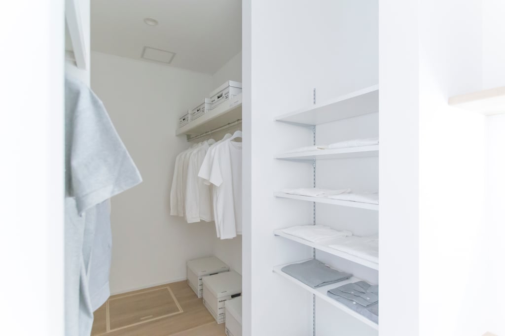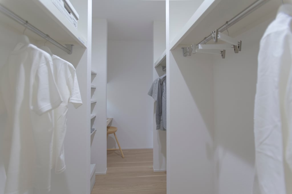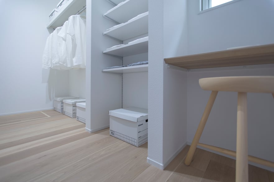 上に本棚があるデスクスペースを備えた4帖のウォークインクローゼット。可動棚5段と上部に棚のある3本のパイプからなる、大容量の収納スペース。